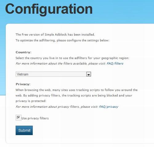 Tại trang điều chỉnh, bạn chỉ việc chọn quốc gia sinh sống, nhằm giúp Simple AdBlock phân tích và giới thiệu thiết lập thích hợp.