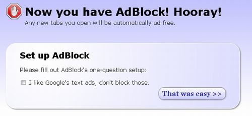 Khi cài đặt, AdBlock lưu ý rằng chúng không chặn quảng cáo được Google cung cấp (Đương nhiên). Nếu đồng ý như vậy, bạn hãy click chọn tại dòng "I like Google's text ads; don't block those". Còn không thì cứ nháy That was easy là xong